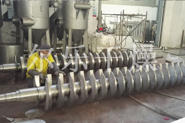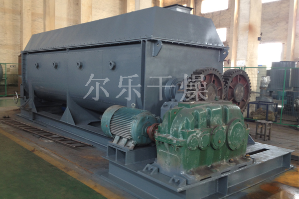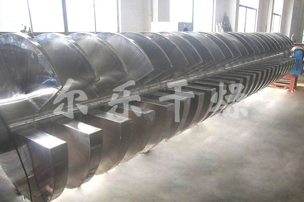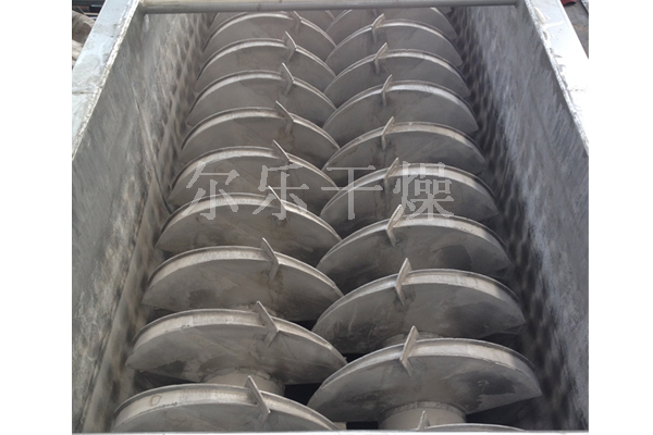 空心軸上密集排列著楔型中空漿葉,熱介質(zhì)經(jīng)空心軸流經(jīng)漿葉。單位有效容積內(nèi)傳熱面積很大,熱介質(zhì)溫度從-40℃到320℃,可以是水蒸汽,也可以是液體型:如熱水、導熱油等。間接傳導加熱,沒有攜帶空氣帶走熱量,熱量均用來加熱物料。熱量損失僅為通過器體保溫層向環(huán)境的散熱。楔型漿葉傳熱面具有自清潔功能。物料顆粒與楔型面的相對運動產(chǎn)生洗刷作用,能夠洗刷掉楔型面上附著物料,使運轉(zhuǎn)中一直保持著清潔的傳熱面。漿葉干燥機的殼體為Ω型,殼體內(nèi)一般安排二到四根空心攪拌軸。殼體有密封端蓋與上蓋,防止物料粉塵外泄而充分發(fā)揮作用。