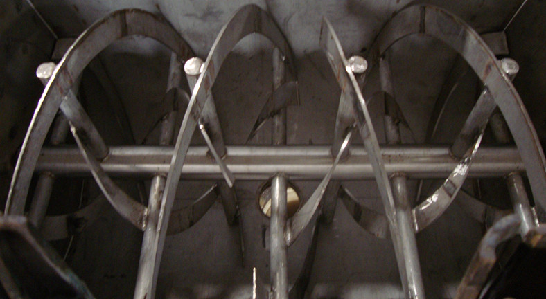 臥式螺帶混合機由安裝于攪拌軸上的內(nèi)外徑螺旋帶動桶體內(nèi)物料翻動,使攪拌器在桶體內(nèi)大范圍翻動物料。攪拌器結(jié)構(gòu)上,螺旋設(shè)計成內(nèi)外、左右互為反螺旋,攪拌器工作時內(nèi)螺旋帶動靠近軸心處物料做軸心旋轉(zhuǎn),軸向由內(nèi)至兩側(cè)推動,外螺旋帶動靠近筒壁物料做軸心旋轉(zhuǎn),軸向由兩側(cè)至內(nèi)推動,于是造成物料在筒體內(nèi)對流循環(huán)、剪切滲混,完成物料在較短時間內(nèi)快速均勻混合。