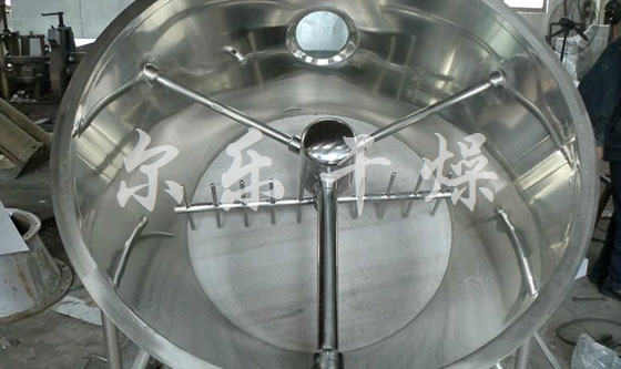 空氣經(jīng)加熱凈化后,由引風(fēng)機(jī)從下部導(dǎo)入,穿過料斗的孔洞板。在工作室內(nèi),經(jīng)攪拌和負(fù)壓作用形成流態(tài)化,水份快速蒸發(fā)后隨著排氣帶走,物料快速干燥。